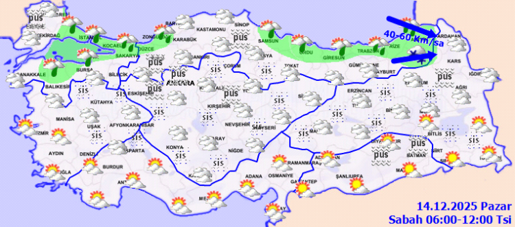 Sabah ve gece saatlerinde Marmara'nın güney ve doğusu ile iç ve doğu bölgelerde pus ve yer yer sis etkili olacak. Hava sıcaklıklarının mevsim normalleri civarında seyretmesi beklenirken, rüzgârın genellikle kuzeyli yönlerden hafif, zaman zaman orta kuvvette eseceği bildirildi.