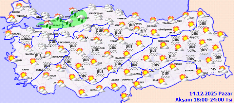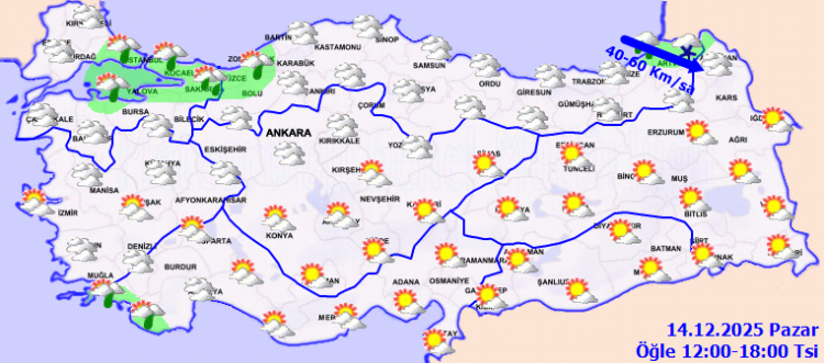 Meteoroloji, 14 Aralık'ta Türkiye genelinde parçalı bulutlu hava ve bazı bölgelerde yağış uyarısı yaptı. Marmara, Karadeniz kıyıları, Batı Karadeniz, Yozgat, Antalya, Sivas çevresinde yağmur, yükseklerde kar bekleniyor. Rüzgar, kuzeyli yönlerden esecek.